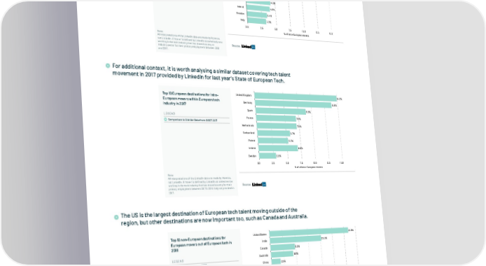 04.2 People Flows Looking more closely at just migratory tech talent moving Looking more closely at just intra-European migratory tech talent moving within within Europe, Germany is now the joint #1 destination the region, Germany is now the joint #1 destination together with the UK together with the UK Top 10 European destinations for intra- United Kingdom 14.6% European movers within European tech Germany 14.6% industry in 2018 Spain 8.5% LEGEND France 8.1% Top 10 destinations in 2018 Netherlands 7.7% Switzerland 5.9% Poland 4.2% Ireland 4.0% Sweden 3.4% Italy 3.2% 0.0 2.5 5.0 7.5 10.0 12.5 15.0 % of intra-European movers Note: All interpretations of the LinkedIn data are made by Atomico, not LinkedIn. A 'mover' is deïned by LinkedIn as somebody now Source: working in the tech industry that has moved country or industry sector for their primary employment between 2018 and 2017. For additional context, it is worth analysing a similar dataset covering tech talent For additional context, it is worth analysing a similar dataset covering tech talent movement in 2017 provided by movement in 2017 provided by LinkedIn for last year’s State of European Tech. LinkedIn for last year’s State of European Tech Top 10 European destinations for intra- United Kingdom 14.9% European movers within European tech Germany 13.8% industry in 2017 Spain 8.9% LEGEND France 7.0% Comparison to Similar Data from SOET 2017 Netherlands 7.0% Switzerland 5.7% Poland 5.3% Ireland 6.9% Sweden 2.9% 0.0 2.5 5.0 7.5 10.0 12.5 15.0 % of all intra-European movers Note: All interpretations of the LinkedIn data are made by Atomico, not LinkedIn. A ‘mover’ is deïned by LinkedIn as someone now Source: working in the tech industry that has moved country for their primary employment between 2017 & 2016. Italy not provided in 2017. The US is the largest destination of European tech talent moving outside of the The US is the largest destination of European tech talent moving outside of the region, but other destinations are region, but other destinations are now important too, such as Canada and Australia. now important too, such as Canada and Australia. Top 10 non-European destinations for United States 31.9% European movers out of European tech in India 20.3% 2018 Canada 9.5% LEGEND Australia 8.6% Top 10 Destinations - 2018 China 3.5% United Arab Emirates 2.5% Brazil 2.2% Singapore 2.0% New Zealand 1.8% Japan 1.5% 0.0 5.0 10.0 15.0 20.0 25.0 30.0 35.0 % of tech movers Note: All interpretations of the LinkedIn data are made by Atomico, not LinkedIn. A 'mover' is deïned by LinkedIn as somebody now Source: working in the tech industry that has moved country or industry sector for their primary employment between 2018 and 2017. & 47 In Partnership with www.thestateofeuropeantech.com