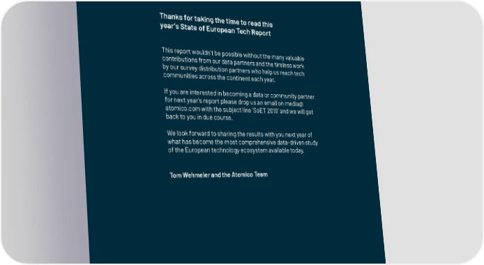 Thanks for taking the time to read this year’s State of European Tech Report This report wouldn’t be possible without the many valuable contributions from our data partners and the tireless work by our survey distribution partners who help us reach tech communities across the continent each year. If you are interested in becoming a data or community partner for next year’s report please drop us an email on media@ atomico.com with the subject line ‘SoET 2019’ and we will get back to you in due course. We look forward to sharing the results with you next year of what has become the most comprehensive data-driven study of the European technology ecosystem available today. Tom Wehmeier and the Atomico Team In Partnership with &