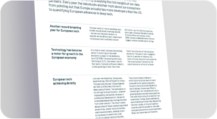 Executive Summary For the past four years, we’ve produced an exhaustive deep dive into the European tech ecosystem by analysing the rich insights of our data partners. Every year the data busts another myth about our ecosystem: from pointing out that Europe actually has more developers than the US, to quantifying European advances in deep tech. Another record breaking This year we’re at risk of sounding like a $23 billion - up from $5 billion just five year for European tech broken record about breaking records years ago. European founders created - but we can’t dispute the data. In 17 billion-dollar companies. And in another extraordinary year, investment 2018, Europe produced three of the ten in European tech reached a record biggest venture backed public listings. Technology has become At a macro-level, Europe’s technology faster than the rest of the European a motor for growth in the sector is booming as the wider economy. This year’s report suggests European economy economy is stuck in the doldrums. that for a number of reasons, this As of Q3 2018, European growth was motor will only become more powerful. flatlining at 0.2%, the lowest rate for The importance of the tech to the four years. Europe’s software industry overall economy will only increase. is now growing at least five times European tech Last year we found that Europe was This all contributes to ‘density’ - achieving density experiencing a ‘Battle Royale’ for talent. which historically has been a crucial This year was the year Europe figured precondition for explosive growth. out how to effectively mobilise its Europe is certainly achieving density, deep pools of talent. The tech sector is but it’s doing it its own way. What is attracting more participants - whether interesting is that the developer pool is measured by the healthy increase in growing fastest outside those countries professional developers or the uptick that have historically attracted the most in talented executives moving into tech investment: Turkey, Spain and Russia’s from other sectors. The report shows pool of developers have been deepening dense areas of talent coalescing around the most rapidly. All this will lead to a universities, anchor tech companies, massive potential upside for the wider and innovation hubs, leading in turn European economy as capital eventually to increases in investment, and flows into these new communities. growth in anchor tech companies. Europe is a research This year’s report also shows science and tech converge further, powerhouse that we are only scratching the there is huge scope to strengthen surface of the potential of Europe’s the link between European STEM research community, and not fully and startups. Europe has a research harnessing our own cutting-edge community larger than U.S. and China science. An analysis by CERN, one - we need to make sure this becomes of this community’s most influential the hugely powerful differentiator it members, demonstrates that as should be. & 9 In Partnership with www.thestateofeuropeantech.com