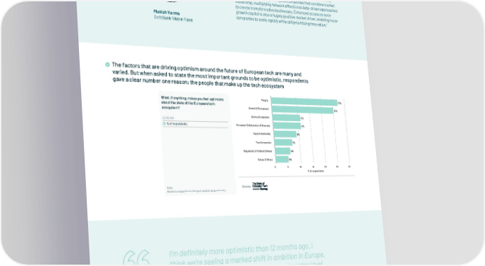 02.4 Smiles (almost) all round in European tech 2018 has seen some strong wins for the European tech ecosystem and we are resoundingly optimistic and excited by the opportunity set we see emerging. “ 2018 has seen some strong wins for the European tech ecosystem and we are resoundingly optimistic and excited by the opportunity set we see emerging. There were several large IPOs in the region signalling that the sector is maturing while still generating opportunities to partner with emerging, disruptive companies that combine market leadership, multiplying network effects and data-driven approaches to create transformative businesses. Enhanced access to early growth capital is also a hugely positive market driver, enabling more Munish Varma companies to scale rapidly while still prioritising innovation.” SoftBank Vision Fund The factors that are driving optimism around the future of European tech are many and The factors that are driving optimism around the future of European tech are many and varied. But when asked to varied. But when asked to state the most important grounds to be optimistic, respondents state the most important grounds to be optimistic, respondents gave a clear number one reason: the people that gave a clear number one reason: the people that make up the tech ecosystem make up the tech ecosystem What, if anything, makes you feel optimistic People 27% about the state of the European tech ecosystem? Growth & Momentum 25% Startup Ecosystem 11% LEGEND % of respondents European Collaboration & Diversity 11% Capital Availability 9% Tech Innovation 7% Regulation & Political Climate 6% Values & Ethics 5% 0 5 10 15 20 25 30 % of respondents Note: Source: Based on respondents that gave explicit responses only. I’m definitely more optimistic than 12 months ago. I think we’re seeing a marked shift in ambition in Europe, and crucially, that’s being matched at an investor level. “ I’m definitely more optimistic than 12 months ago. I think we’re seeing a marked shift in ambition in Europe, and crucially, that’s being matched at an investor level. What’s more, the increased cost of living and hiring competition seem to have taken the blinkers off a lot of Valley-bound entrepreneurs. This can only benefit Europe.” Rosie Dallas Fat Llama 23 In Partnership with & www.thestateofeuropeantech.com