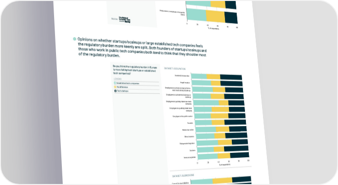 07.1 Embracing Regulation This willingness to build bridges is important since key stakeholders in the European tech ecosystem take a majority view that European regulation makes it harder to This willingness to build bridges is important since key stakeholders in the European tech ecosystem take a start and scale a technology business in the region. majority view that European regulation makes it harder to start and scale a technology business in the region European regulation makes it harder to start and scale a technology business Founder or startup/scale-up employee LEGEND Agree Neither agree nor disagree Disagree Venture capitalist Policymaker or employee in the public sector 0 20 40 60 80 100 % of respondents Source: Opinions on whether startups/scaleups or large established tech companies feels Unsurprisingly then, Founders also believe they feel more of the regulatory burden in Europe than established tech the regulatory burden more keenly are split. Both founders of startups/scaleups and Unsurprisingly then, Founders also believe they feel more of the regulatory burden in Europe than established tech companies. Of course, if you ask those that work at public tech companies, they are more likely to say the those who work in public tech companies both tend to think that they shoulder most companies. Of course, if you ask those that work at public tech companies, they are more likely to say the opposite. Unsurprisingly then, Founders also believe they feel more of the regulatory burden in Europe than established tech of the regulatory burden. opposite. companies. Of course, if you ask those that work at public tech companies, they are more likely to say the Do you think the regulatory burden in Europe Academic/researcher opposite. is more felt by tech startups or established Academic/researcher Do you think the regulatory burden in Europe DATASET: OCCUPATION tech companies? Angel investor is more felt by tech startups or established tech companies? Angel investor Do you think the regulatory burden in Europe Academic/researcher DATASET: OCCUPATION Employee at a private company that is is more felt by tech startups or established DATASET: OCCUPATION not a tech startup/scale-up LEGEND Employee at a private company that is tech companies? Angel investor not a tech startup/scale-up LEGEND Employee at a private tech startup or Established tech companies DATASET: OCCUPATION scale-up Established tech companies Employee at a private tech startup or No difference Employee at a private company that is scale-up not a tech startup/scale-up LEGEND Employee at a publicly listed non-tech No difference Tech startups company Employee at a publicly listed non-tech Established tech companies Employee at a private tech startup or Tech startups company scale-up No difference Employee at a publicly listed tech company Employee at a publicly listed tech Tech startups Employee at a publicly listed non-tech company company Employee in the public sector Employee at a publicly listed tech Employee in the public sector company Founder Founder Employee in the public sector Media/Journalist Media/Journalist Founder Other investor Other investor Media/Journalist Policymaker/regulator Policymaker/regulator Other investor Student Student Policymaker/regulator Venture capitalist Venture capitalist Student 0 20 40 60 80 100 % of respondents Venture capitalist 0 20 40 60 80 100 % of respondents 0 20 40 60 80 100 Unsurprisingly then, Founders also believe they feel more of the regulatory burden in Europe than established tech Source: % of respondents Source: companies. Of course, if you ask those that work at public tech companies, they are more likely to say the opposite. DATASET: SUBREGIONS Source: Do you think the regulatory burden in Europe Central Europe & Baltics is more felt by tech startups or established tech companies? DACH DATASET: SUBREGIONS Eastern Europe LEGEND Established tech companies France & Benelux No difference Tech startups Nordics Southern Europe UK & Ireland 0 20 40 60 80 100 % of respondents Source: & 94 In Partnership with www.thestateofeuropeantech.com