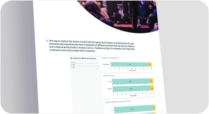 03.3 Accelerating Change Photo: Anrietta Kuosku One way to explore the extent to which the European tech industry is tackling diversity and One way to explore the extent to which the European tech industry is tackling diversity and inclusion is by inclusion is by examining the level of adoption of different policies that can help to enable a One way to explore the extent to which the European tech industry is tackling diversity and inclusion is by examining the level of adoption of different policies that can help to enable a more diverse and inclusive company more diverse and inclusive company culture. Flexible working, for example, has a high level examining the level of adoption of different policies that can help to enable a more diverse and inclusive company culture. Flexible working, for example, has a high level of adoption among European tech companies. of adoption among European tech companies. culture. Flexible working, for example, has a high level of adoption among European tech companies. My company has a exible working policy DATASET: ALL RESPONDENTS My company has a exible working policy DATASET: ALL RESPONDENTS DATASET: ALL RESPONDENTS LEGEND All respondents 91% 9% LEGEND All respondents 91% 9% Yes Yes 0 10 20 30 40 50 60 70 80 90 100 No One way to explore the extent to which the European tech industry is tackling diversity and inclusion is by % of respondents No 0 10 20 30 40 50 60 70 80 90 100 % of respondents examining the level of adoption of different policies that can help to enable a more diverse and inclusive company culture. Flexible working, for example, has a high level of adoption among European tech companies. Source: Note: DATASET: INDUSTRY Source: Company size only includes founder and startup/scale-up Note: employees. My company has a exible working policy Company size only includes founder and startup/scale-up employees. Tech 92% 8% DATASET: INDUSTRY LEGEND Yes Non-tech No 90% 10% One way to explore the extent to which the European tech industry is tackling diversity and inclusion is by examining the level of adoption of different policies that can help to enable a more diverse and inclusive company 0 10 20 30 40 50 60 70 80 90 100 culture. Flexible working, for example, has a high level of adoption among European tech companies. % of respondents My company has a exible working policy DATASET: COMPANY SIZE BY # OF EMPLOYEES Source: DATASET: COMPANY SIZE BY # OF EMPLOYEES LEGEND Yes <=10 94% 6% No Note: Company size only includes founder and startup/scale-up 11-100 92% 8% employees. 100+ 88% 12% 0 10 20 30 40 50 60 70 80 90 100 % of respondents Note: Note: Company size only includes founder and startup/scale-up Source: Company size only includes founder and startup/scale-up employees. employees. & 39 In Partnership with www.thestateofeuropeantech.com