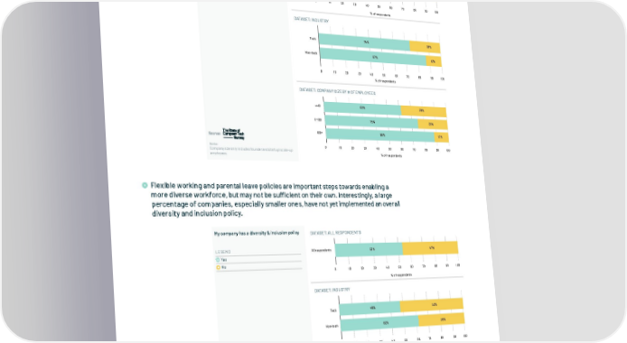 03.3 Accelerating Change Similarly, founders and employees of Europe’s private tech startups and scale-ups report high levels of adoption of dedicated parental leave policies, though there is a marked Similarly, founders and employees of Europe's private tech startups and scaleups report high levels of adoption of difference based on company size. In fact, nearly 40% of companies that are still fewer dedicated parental leave policies, though there is a marked difference based on company size. In fact, nearly 40% than 10 employees have yet to put in place a parental leave policy of companies that are still fewer than 10 employees have yet to put in place a parental leave policy My company has a parental leave policy DATASET: ALL RESPONDENTS LEGEND All respondents 78% 22% Yes Similarly, founders and employees of Europe's private tech startups and scaleups report high levels of adoption of No 0 10 20 30 40 50 60 70 80 90 100 dedicated parental leave policies, though there is a marked difference based on company size. In fact, nearly 40% of companies that are still fewer than 10 employees have yet to put in place a parental leave policy % of respondents DATASET: INDUSTRY My company has a parental leave policy DATASET: INDUSTRY Tech 74% 26% LEGEND Yes No Non-tech 87% 13% Similarly, founders and employees of Europe's private tech startups and scaleups report high levels of adoption of Note: Company size only includes founder and startup/scale-up dedicated parental leave policies, though there is a marked difference based on company size. In fact, nearly 40% employees. 0 10 20 30 40 50 60 70 80 90 100 of companies that are still fewer than 10 employees have yet to put in place a parental leave policy % of respondents My company has a parental leave policy DATASET: COMPANY SIZE BY # OF EMPLOYEES DATASET: COMPANY SIZE BY # OF EMPLOYEES LEGEND <=10 62% 38% Yes No 11-100 75% 25% Note: Company size only includes founder and startup/scale-up 100+ 88% 12% employees. Note: 0 10 20 30 40 50 60 70 80 90 100 Company size only includes founder and startup/scale-up % of respondents employees. Flexible working and parental leave policies are important steps towards enabling a more diverse workforce, but may not be sufficient on their own. Interestingly, a large Similarly, founders and employees of Europe's private tech startups and scaleups report high levels of adoption of percentage of companies, especially smaller ones, have not yet implemented an overall dedicated parental leave policies, though there is a marked difference based on company size. In fact, nearly 40% of companies that are still fewer than 10 employees have yet to put in place a parental leave policy diversity and inclusion policy. My company has a diversity & inclusion policy DATASET: ALL RESPONDENTS LEGEND All respondents 53% 47% Yes Similarly, founders and employees of Europe's private tech startups and scaleups report high levels of adoption of No 0 10 20 30 40 50 60 70 80 90 100 dedicated parental leave policies, though there is a marked difference based on company size. In fact, nearly 40% of companies that are still fewer than 10 employees have yet to put in place a parental leave policy % of respondents DATASET: INDUSTRY My company has a parental leave policy DATASET: INDUSTRY Tech 48% 52% LEGEND Yes No Non-tech 62% 38% Note: Similarly, founders and employees of Europe's private tech startups and scaleups report high levels of adoption of Company size only includes founder and startup/scale-up dedicated parental leave policies, though there is a marked difference based on company size. In fact, nearly 40% employees. 0 10 20 30 40 50 60 70 80 90 100 of companies that are still fewer than 10 employees have yet to put in place a parental leave policy % of respondents My company has a parental leave policy DATASET: COMPANY SIZE BY # OF EMPLOYEES DATASET: COMPANY SIZE BY # OF EMPLOYEES LEGEND <=10 41% 59% Yes No 11-100 42% 58% Note: Company size only includes founder and startup/scale-up 100+ 58% 42% employees. Note: Company size only includes founder and startup/scale-up 0 10 20 30 40 50 60 70 80 90 100 employees. % of respondents & 40 In Partnership with www.thestateofeuropeantech.com