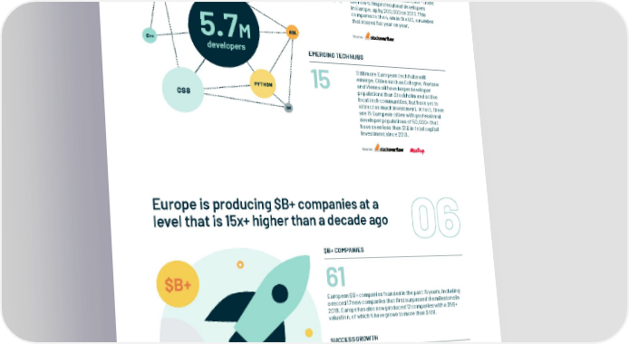 2018 Key Findings Mobilising Europe’s hidden tech talent pool can unlock huge upside PROFESSIONAL DEVELOPERS Europe’s ecosystem is more distributed and more interconnected than ever - there M are now 5.7m professional developers 5.7 in Europe, up by 200,000 on 2017. This compares to the 4.4m in the US, a number that stayed flat year on year. EMERGING TECH HUBS Still more European tech hubs will emerge. Cities such as Cologne, Warsaw 15 and Vienna all have larger developer populations than Stockholm and active local tech communities, but have yet to attract as much investment. In fact, there are 15 European cities with professional developer populations of 50,000+ that have seen less than $1B in total capital investment since 2013. Europe is producing $B+ companies at a level that is 15x+ higher than a decade ago $B+ COMPANIES 61 European $B+ companies founded in the past 15 years, including a record 17 new companies that first surpassed the milestone in 2018. Europe has also now produced 12 companies with a $5B+ valuation, of which 5 have grown to more than $10B. SUCCESS GROWTH X 15 Two companies founded in the 2000s had reached $B+ by 2008. Compare that to 31 founded in the 2010s that reached that milestone by 2018 - an increase of 15.5x. Where will the 2010s end up by 2028? & 6 In Partnership with www.thestateofeuropeantech.com