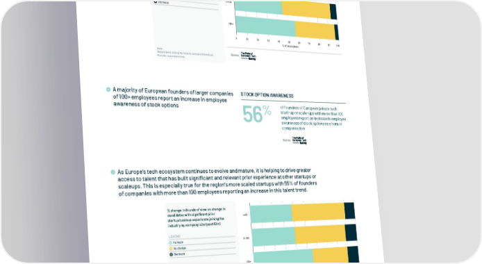 04.4 Competing For & Compensating Talent A positive effect of awareness-building campaigns, led in part by strong arguments from Europe’s leading VCs, is evident in a reported increase in employee awareness of stock A positive effect of awareness-building campaigns, led in part by strong arguments from Europe's leading VCs, is options as a form of compensation. This increased awareness is most prevalent in larger evident in a reported increase in employee awareness of stock options as a form of compensation. This increased companies of 100 employees or more. awareness is most prevalent in larger companies of 100 employees or more. Founders' view on change in employees awareness of stock options as form of <=10 compensation by company size LEGEND Increase No change 11-100 Decrease 100+ 0 10 20 30 40 50 60 70 80 90 100 % of respondents Note: Respondents stating 'Not able to comment' ïltered out. Source: Founder respondents only. A majority of European founders of larger companies STOCK OPTION AWARENESS of 100+ employees report an increase in employee awareness of stock options of founders of European private tech % start-up or scale-ups with more than 100 56 employees report an increase in employee awareness of stock options as a form of compensation As Europe’s tech ecosystem continues to evolve and mature, it is helping to drive greater As Europe's tech ecosystem continues to evolve and mature, it is helping to drive greater access to talent that has access to talent that has built significant and relevant prior experience at other startups or built signiïcant and relevant prior experience at other startups or scaleups. This is especially true for the region's scaleups. This is especially true for the region’s more scaled startups with 55% of founders more scaled startups with 55% of founders of companies with more than 100 employees reporting an increase in of companies with more than 100 employees reporting an increase in this talent trend. this talent trend. % change in founders' view on change in candidates with signiïcant prior <=10 startup/scaleup experience joining the industry by company size (past 12m) LEGEND Increase 11-100 No change Decrease 100+ 0 10 20 30 40 50 60 70 80 90 100 % of respondents Note: Respondents stating 'Not able to comment' ïltered out. Source: Founder respondents only. & 56 In Partnership with www.thestateofeuropeantech.com