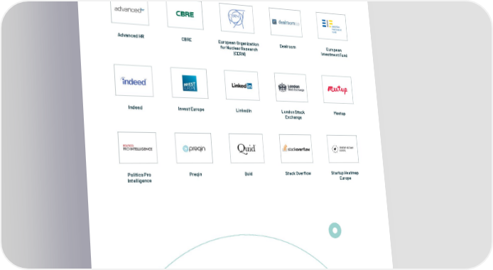 Our Data Partners Advanced HR CBRE European Organization Dealroom European for Nuclear Research Investment Fund (CERN) Indeed Invest Europe LinkedIn London Stock Meetup Exchange Politico Pro Preqin Quid Stack Overflow Startup Heatmap Intelligence Europe 152 In Partnership with & www.thestateofeuropeantech.com