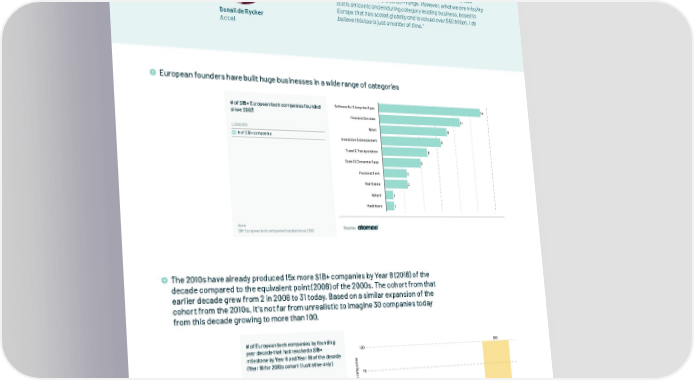 09.1 Billion-Dollar Companies The gripe used to be that Europe had yet to prove it could be home to multiple $1 billion+ businesses. We have decisively put that question to rest. The gripe used to be that Europe had yet to prove it could be home to multiple $1 billion+ businesses. We have decisively put that question to rest. Momentum has accelerated, and now we are able to regularly build businesses that surpass the $5 billion+ threshold and have produced two in the $15 billion+ range. However, what we are missing “ still is an iconic and enduring category leading business, based in Europe that has scaled globally and is valued over $50 billion. I do Sonali de Rycker believe this too is just a matter of time.” Accel European founders have built huge businesses in a wide European founders have built huge businesses in a wide range of categories range of categories # of $1B+ European tech companies founded Software for Enterprise Apps 14 since 2003 Financial Services 11 LEGEND Retail 9 # of $1B+ companies Interactive Entertainment 8 Travel & Transportation 6 Social & Consumer Apps 5 Food and Drink 3 Real Estate 3 Adtech 1 Healthcare 1 Note: Source: $B+ European tech companies founded since 2003 The 2010s have already produced 15x more $1B+ companies by Year 8 (2018) of the decade compared to the equivalent point (2008) of the 2000s. The cohort from that The 2010s have already produced 15x more $B+ companies by Year 8 (2018) of the decade compared to the earlier decade grew from 2 in 2008 to 31 today. Based on a similar expansion of the equivalent point (2008) of the 2000s. The cohort from that earlier decade grew from 2 in 2008 to 31 today. Based cohort from the 2010s, it’s not far from unrealistic to imagine 30 companies today on a similar expansion of the cohort from the 2010s, it's not far from unrealistic to imagine 30 companies today from this decade growing to more than 100. from this decade growing to more than 100. # of European tech companies by founding year decade that had reached a $1B+ 100 100 milestone by Year 8 and Year 18 of the decade s e (Year 18 for 2010s cohort illustrative only) i n mpa75 o c LEGEND h c e t 2000s n a 2010s pe o 50 r u E + B 1 $ 31 f 30 o # 25 2 0 Year 8 Year 18 Note: $1B+ European tech companies split by the decade of the Source: founding year. The 100 number shown for Year 18 of the 2010s is illustrative only. 128 In Partnership with & www.thestateofeuropeantech.com