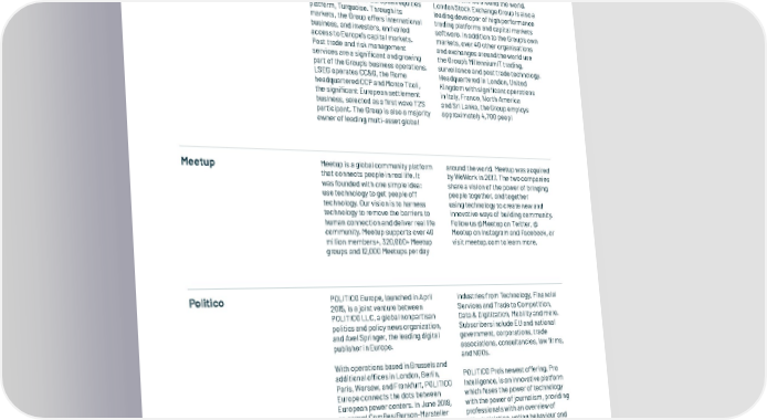14.1 Our Data Partners London Stock Exchange London Stock Exchange Group CCP, LCH. (LSE.L) is a diversified international exchange Group that sits at the heart The Group offers its customers an of the world’s financial community. extensive range of real-time and The Group can trace its history back reference data products, including to 1801. The Group operates a broad Sedol, UnaVista and RNS. FTSE range of international equity, bond calculates thousands of unique and derivatives markets, including indices that measure and benchmark London Stock Exchange; Borsa Italiana; markets and asset classes in more MTS, Europe’s leading fixed income than 80 countries around the world. market; and the pan-European equities London Stock Exchange Group is also a platform, Turquoise. Through its leading developer of high performance markets, the Group offers international trading platforms and capital markets business, and investors, unrivalled software. In addition to the Group’s own access to Europe’s capital markets. markets, over 40 other organisations Post trade and risk management and exchanges around the world use services are a significant and growing the Group’s MillenniumIT trading, part of the Group’s business operations. surveillance and post trade technology. LSEG operates CC&G, the Rome Headquartered in London, United headquartered CCP and Monte Titoli, Kingdom with significant operations the significant European settlement in Italy, France, North America business, selected as a first wave T2S and Sri Lanka, the Group employs participant. The Group is also a majority approximately 4,700 peopl owner of leading multi-asset global Meetup Meetup is a global community platform around the world. Meetup was acquired that connects people in real life. It by WeWork in 2017. The two companies was founded with one simple idea: share a vision of the power of bringing use technology to get people off people together, and together technology. Our vision is to harness using technology to create new and technology to remove the barriers to innovative ways of building community. human connection and deliver real life Follow us @Meetup on Twitter, @ community. Meetup supports over 40 Meetup on Instagram and Facebook, or million members+, 320,000+ Meetup visit meetup.com to learn more. groups and 12,000 Meetups per day Politico POLITICO Europe, launched in April industries from Technology, Financial 2015, is a joint venture between Services and Trade to Competition, POLITICO LLC, a global nonpartisan Data & Digitization, Mobility and more. politics and policy news organization, Subscribers include EU and national and Axel Springer, the leading digital government, corporations, trade publisher in Europe. associations, consultancies, law firms, and NGOs. With operations based in Brussels and additional offices in London, Berlin, POLITICO Pro’s newest offering, Pro Paris, Warsaw, and Frankfurt, POLITICO Intelligence, is an innovative platform Europe connects the dots between which fuses the power of technology European power centers. In June 2018, with the power of journalism, providing an annual ComRes/Burson-Marsteller professionals with an overview of survey ranked POLITICO Europe as bills, legislation, voting behaviour and the #1 most influential publication on attendance, tweets, activities, press European affairs, for the second year releases, transcripts and more, at the running. touch of a button. Users can track information on the EU Institutions and POLITICO’s premium policy intelligence national legislatures in the UK, France service, POLITICO Pro, empowers and Germany. Pro Intelligence was used thousands of policy experts and by Atomico to research data on EU Tech decision-makers from over 730 legislation for this report. organizations in 28 countries, on key 163 In Partnership with & www.thestateofeuropeantech.com
