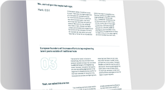 12.1 What We Got Right and Wrong Last Year A venture-backed European tech startup will exit for a $B+ to a traditional non-tech European giant Non-tech European corporates have millions (for example, BNP Paribas and already made billion-dollar tech Compte Nickel). This will change in 2018 acquisitions (Anglo-Dutch Unilever as European non-tech corporates put picked up Dollar Shave Club), but some of their combined $1.5 trillion acquisitions within Europe have cash holdings to work. typically been in the hundreds of We...sort-of got this maybe half-right Mark: 0.5/1 In the purest sense, this did not come enterprise value of around $6 billion. to pass. There was no single acquisition Siemens, the German industrial giant, of a European VC-backed company acquired Mendix, a Netherlands- for more than $1 billion to a traditional born, -funded and -raised enterprise non-tech European giant. But that’s software company, for $730 million. not to say that there was not plenty of In other smaller, but still meaningful relevant M&A activity that validated transactions, ING Group acquired this trend. In fact, the year started in Payvision for a fee that valued the January with Richemont’s acquisition of business at more than $500 million, full control of the European, formerly- while Munich Re acquired Berlin’s Relayr VC-backed, but now public company for $300 million. All this taken together, Yoox Net-a-Porter for an implied total we think this deserves a half mark. European founders will increase efforts to tap engineering talent pools outside of traditional hubs The battle for talent in Europe is ensuring talent flows are not a one- intensifying. Not only are there more way street into tech. In order to stay venture-backed startups that are better competitive in this context, European funded and hungrier for engineering founders will look for creative ways to talent than ever, but global tech giants best exploit the untapped engineering are also expanding aggressively in the talent pools in less obvious places. region with inflated salaries on offer for For example, we expect to see more the most talented. At the same time, satellite offices opening up across the European corporates are fighting back, region in upcoming hubs. Yeah, we nailed this one too Mark: 1/1 This trend has certainly taken hold in already opened satellite offices to Europe in 2018, driven by increasing tap new talent pools and 80% of levels of competition for talent in core those founders expressed increased European tech hubs and a growing interested in opening additional awareness of the depth of talent in offices. As one example, N26 has emerging hubs. According to the more opened its first major office outside of than 1,000 founders that responded Berlin, choosing Barcelona to build an to this year’s State of European Tech office that will quickly expand to 100 Survey, more than 50% of companies employees. with more than 100 employees have 147 In Partnership with & www.thestateofeuropeantech.com
