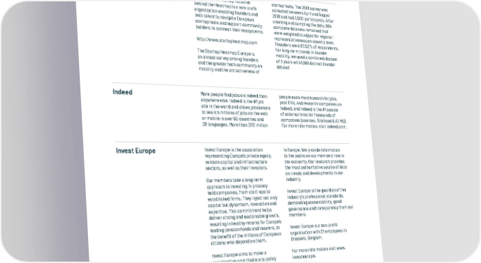 14.1 Our Data Partners EIF The European Investment Fund (EIF) is capital, guarantees and microfinance part of the European Investment Bank instruments, which specifically target group. Its central mission is to support this market segment. In this role, EIF Europe’s micro, small and medium- fosters EU objectives in support of sized businesses (SMEs) by helping innovation, research and development, them to access finance. EIF designs entrepreneurship, growth, and and develops venture and growth employment. European Startup Initiative The European Startup initiative startup hubs. The 2018 survey was behind the Heatmap is a non-profit collected between April and August organization enabling founders and 2018 and had 1,500 participants. After tech talent to navigate European cleaning and sampling the data, 984 startup hubs and support community complete datasets remained that builders to connect their ecosystems. were weighted to adjust for regional representativeness on country level. http://www.startupheatmap.com Founders were 57.52% of respondents. For long-term trends in founder The Startup Heatmap Europe is mobility, we used a combined dataset an annual survey among founders of 3 years with 1,661 distinct founder and the greater tech community on dataset mobility and the attractiveness of Indeed More people find jobs on Indeed than people each month search for jobs, anywhere else. Indeed is the #1 job post CVs, and research companies on site in the world and allows jobseekers Indeed, and Indeed is the #1 source to search millions of jobs on the web of external hires for thousands of or mobile in over 60 countries and companies (sources: SilkRoad & iCIMS). 28 languages. More than 200 million For more information, visit indeed.com. Invest Europe Invest Europe is the association in Europe. We provide information representing Europe’s private equity, to the public on our members’ role in venture capital and infrastructure the economy. Our research provides sectors, as well as their investors. the most authoritative source of data on trends and developments in our Our members take a long-term industry. approach to investing in privately held companies, from start-ups to Invest Europe is the guardian of the established firms. They inject not only industry’s professional standards, capital but dynamism, innovation and demanding accountability, good expertise. This commitment helps governance and transparency from our deliver strong and sustainable growth, members. resulting in healthy returns for Europe’s leading pension funds and insurers, to Invest Europe is a non-profit the benefit of the millions of European organisation with 21 employees in citizens who depend on them. Brussels, Belgium. Invest Europe aims to make a For more information visit www. constructive contribution to policy investeurope. affecting private capital investment LinkedIn Founded in 2003, LinkedIn connects network on the Internet. The company the world’s professionals to make has a diversified business model with them more productive and successful. revenue coming from Talent Solutions, With more than 590+ million members Marketing Solutions, and Premium worldwide, including executives from Subscriptions products. Headquartered every Fortune 500 company, LinkedIn in Silicon Valley, LinkedIn has offices is the world’s largest professional across the globe. & 162 In Partnership with www.thestateofeuropeantech.com