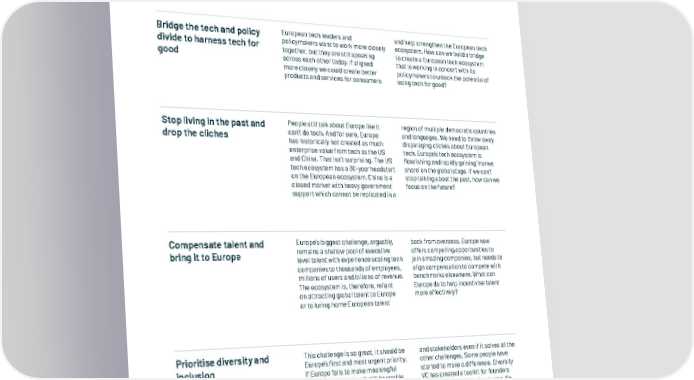 10.1 There’s lots to overcome Build an investor base to The transformation of the European have access to the same capital and target underrepresented investor base into a deep and advice as those in London, Paris or communities increasingly sophisticated network Berlin. This means a new generation of interconnected sources of funding of sophisticated investors in new has elevated European tech to geographies and explicitly seeking to another level. But the job is not close invest in diverse groups of founders. to being finished. Europe’s challenge What can we do to help incentivise is to identify and support emerging and support this next generation of fund managers and angels that can investors? target the communities that do not Bridge the tech and policy European tech leaders and and help strengthen the European tech divide to harness tech for policymakers want to work more closely ecosystem. How can we build a bridge good together, but they are still speaking to create a European tech ecosystem across each other today. If aligned that is working in concert with its more closely we could create better policymakers to unlock the potential of products and services for consumers using tech for good? Stop living in the past and People still talk about Europe like it region of multiple democratic countries drop the cliches can’t do tech. And for sure, Europe and languages. We need to throw away has historically not created as much disparaging clichés about European enterprise value from tech as the US tech. Europe’s tech ecosystem is and China. That isn’t surprising. The US flourishing and rapidly gaining ‘market tech ecosystem has a 30-year headstart share’ on the global stage. If we can’t on the European ecosystem. China is a stop talking about the past, how can we closed market with heavy government focus on the future? support which cannot be replicated in a Compensate talent and Europe’s biggest challenge, arguably, back from overseas. Europe now bring it to Europe remains a shallow pool of executive offers compelling opportunities to level talent with experience scaling tech join amazing companies, but needs to companies to thousands of employees, align compensation to compete with millions of users and billions of revenue. benchmarks elsewhere. What can The ecosystem is, therefore, reliant Europe do to help incentivise talent on attracting global talent to Europe more effectively? or to luring home European talent Prioritise diversity and This challenge is so great, it should be and stakeholders even if it solves all the inclusion Europe’s first and most urgent priority. other challenges. Some people have If Europe fails to make meaningful started to make a difference. Diversity progress on this, it will still be unable VC has created a toolkit for founders to reach its full potential in terms of to address diversity and inclusion. So, creating value for consumers, business what are you doing? & 140 In Partnership with www.thestateofeuropeantech.com