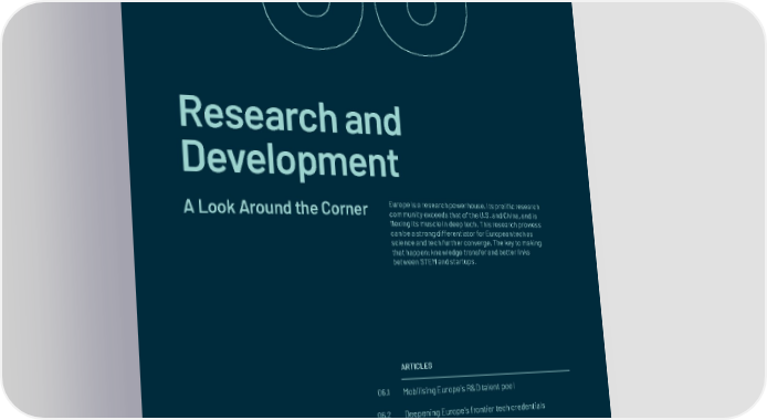 Research and Development A Look Around the Corner Europe is a research powerhouse. Its prolific research community exceeds that of the U.S. and China, and is flexing its muscle in deep tech. This research prowess can be a strong differentiator for European tech as science and tech further converge. The key to making that happen: knowledge transfer and better links between STEM and startups. ARTICLES 06.1 Mobilising Europe’s R&D talent pool 06.2 Deepening Europe’s frontier tech credentials In Partnership with & www.thestateofeuropeantech.com