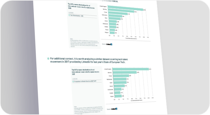 People Flows The UK is the number one destination for all international movers into the European The UK is the number one destination for all international movers into the European tech ecosystem, but it is tech ecosystem, but it is closely followed now by Germany and then France. closely followed now by Germany and then France Top 10 European destinations for all United Kingdom 20.9% international movers into European tech in Germany 15.2% 2018 France 11.1% LEGEND Netherlands 7.8% Top 10 Destinations - 2018 Spain 6.7% Ireland 4.4% Switzerland 4.0% Sweden 3.9% Poland 3.0% Belgium 2.6% 0.0 2.5 5.0 7.5 10.0 12.5 15.0 17.5 20.0 22.5 % of all international movers Note: All interpretations of the LinkedIn data are made by Atomico, not LinkedIn. A 'mover' is deïned by LinkedIn as somebody now Source: working in the tech industry that has moved country or industry sector for their primary employment between 2018 and 2017. For additional context, it is worth analysing a similar dataset covering tech talent For additional context, it is worth analysing a similar dataset covering tech talent movement in 2017 provided by movement in 2017 provided by LinkedIn for last year’s State of European Tech. LinkedIn for last year’s State of European Tech Top 10 European destinations for all United Kingdom 21.5% international movers into European tech in Germany 13.8% 2017 France 9.1% LEGEND Netherlands 7.4% Comparison to Similar Data from SOET 2017 Spain 7.3% Ireland 6.1% Switzerland 4.1% Sweden 3.3% Poland 3.9% 0.0 2.5 5.0 7.5 10.0 12.5 15.0 17.5 20.0 22.5 % of all international movers Note: All interpretations of the LinkedIn data are made by Atomico, not LinkedIn. A ‘mover’ is deïned by LinkedIn as someone now Source: working in the tech industry that has moved country for their primary employment between 2017 & 2016. Belgium not provided in 2017. Germany and UK are now the joint top destinations MIGRANT TALENT IN EUROPEAN TECH for migratory tech talent moving within the European tech industry The same % of all-intra European %movers within the European tech 14.6 industry end in either Germany or the UK as their destination country. & 46 In Partnership with www.thestateofeuropeantech.com